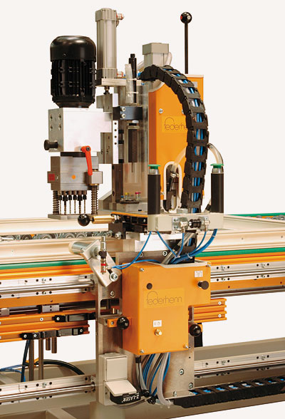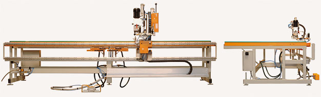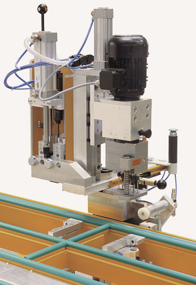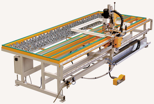For the automatic drilling and screwing of corner supports and scissor bearings. The transport of cladding frames occur manually, the fitting are placed manually.