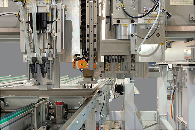 The setting head chooses automatically from the magazines for pivot bearings, scissors bearings, rotating hinges etc.