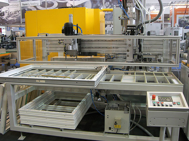 For the automatic drilling, placing and screwing together of pivot- and scissors bearings and/or rotating hinges with a manual frame positioning.