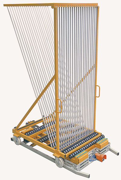 The required glass will be ready to be processed in specific compartments (trolleys). The disks and compartment numbers (shelf numbers) are shown on a display according to each part. This also goes for the pre-cut glass rails.