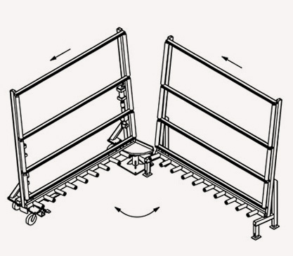 Поднимаемая роликовая площадка для загрузки тяжёлых окон с вертикальных роликовых конвейеров в тележки-накопители![]() |